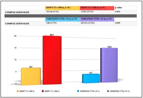 Figure 3 shows the different rates of cardiopulmonary complications in patients with 6MWT-T1 < 458 m and T1-T0 variation < 31 m in comparison to their counterparts with a better ergonometric performance.