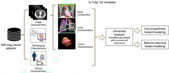This study utilized a cohort of 309 lung cancer patients from the Lung Cancer Database, managed by the Department of Cardiothoracic Surgery at the University of Pittsburgh (Table 1). The inclusion criteria were (1) curative-intent lung resection, (2) pathologically confirmed NSCLC, (3) preoperative chest CT scans with an image thickness of 2.5 mm or less, (4) preoperative PET-CT scans from the neck to the thigh, and (5) a minimum 5 years of follow-up. The pre-treatment chest CT and PET-CT scans closest to the surgery date were used to quantify tumor characteristics and body composition, respectively. Clinical data, including age, sex, smoking history, surgical approach, and pathological stage, were collected through a review medical record. All data were de-identified and re-identified with a unique study ID number by an honest broker to ensure privacy. This study was approved by the University of Pittsburgh Institutional Review Board (IRB) (IRB#: 20100305).