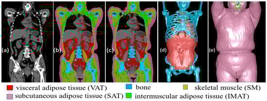 Automated segmentation of body tissue by CNN-based models and manual segmentation on a whole-body PET-CT scan. (a) The original CT image, (b) the manual annotations of the body tissues, and (c) the computer segmentations of the body tissues. (d,e) The 3D visualization of the five body tissues.