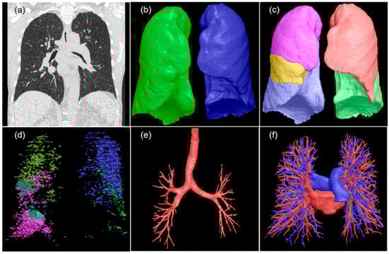 Segmentation of various lung structures. (a) The original CT image; (b–f) the 3D visualization of segmented lungs, lobes, emphysema densities, airways, and pulmonary arteries and veins.