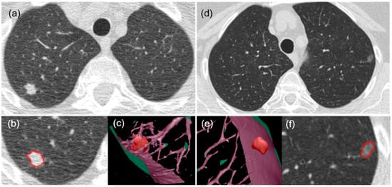 Segmentation of lung tumors on CT images. (a,d) The original CT images, (b,f) the contour of segmented tumors on the enlarged CT images, and (c,e) the 3D visualization of segmented tumors and surrounding areas.