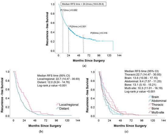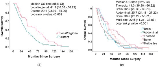 Postoperative RFS and OS were relatively low in this study. Among the 309 patients with non-small-cell lung cancer (NSCLC), 70.9% (219/309) experienced cancer recurrence after surgery. Of these, 20.1% (44/219) had local or regional recurrence, while 79.9% (175/219) experienced distant recurrence. Notably, 88.9% (80/90) of the patients who did not experience recurrence ultimately passed away (Table 1). Kaplan–Meier analysis indicated a 5-year RFS rate of 31.6% (Figure 5a). Patients who experienced local or regional recurrence post-surgery had significantly better 5-year RFS and OS compared to those with distant recurrence (Figure 5b,d). Furthermore, significant differences in RFS and OS were observed based on the location of recurrence. Patients who had recurrence within the thoracic region exhibited notably longer RFS and OS compared to those with recurrence in other organs (Figure 5c,e).