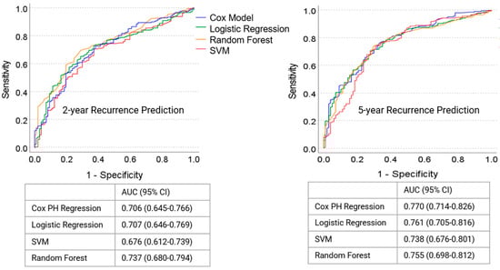 The performance of the Cox PH model was evaluated for predicting 2- and 5-year postoperative recurrences and compared to three machine learning models, including support vector machine (SVM), random forest (RF), and logistic regression (LR). All these models were able to significantly differentiate patients who did or did not experience lung cancer recurrence within 2- or 5-years post-surgery (Figure 6). The random forest method demonstrated the highest performance in the 2-year recurrence analysis (AUC = 0.737, 95% CI: 0.680–0.794), although its performance was not significantly better than the other models. Similarly, the Cox PH model achieved the best performance in the 5-year recurrence analysis (AUC = 0.770, 95% CI: 0.714–0.826), but it was also not significantly superior to the other models. Overall, no significant differences were observed among the four modeling approaches (p > 0.05).