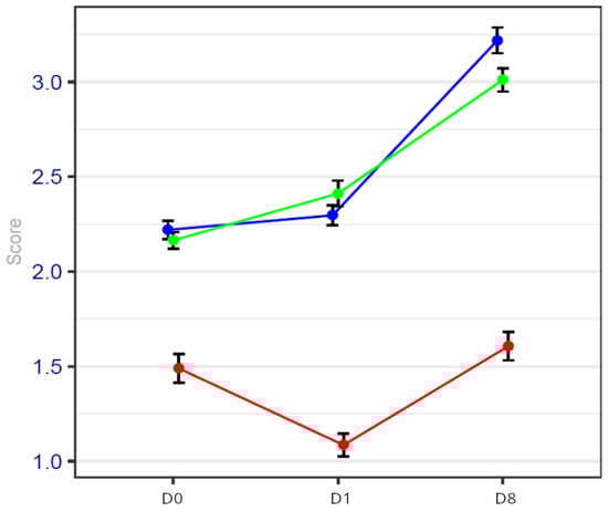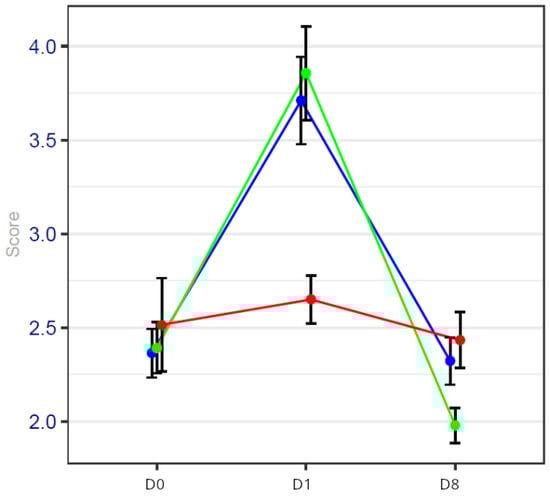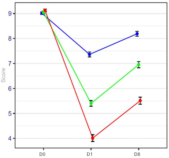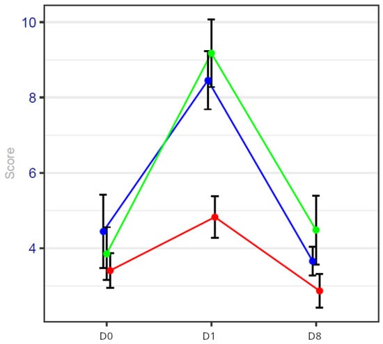 Anxiety score on days 0, 1 and 8 of the procedure. Blue line represents general anesthesia; green line represents general anesthesia + virtual reality; red line represents hypnosis sedation.