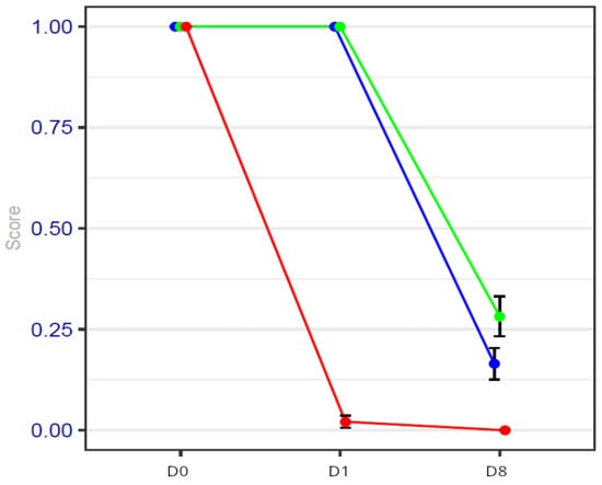 The results of the NLR and CRP are noted in Table 5, Table 6 and Table 7 and Figure 4 and Figure 5. Inflammatory parameter results are expressed as confidence intervals in Table 5 and Table 6; p-values were calculated for the three groups at D0, 1 and 8, and detailed results can be found in Table 7.