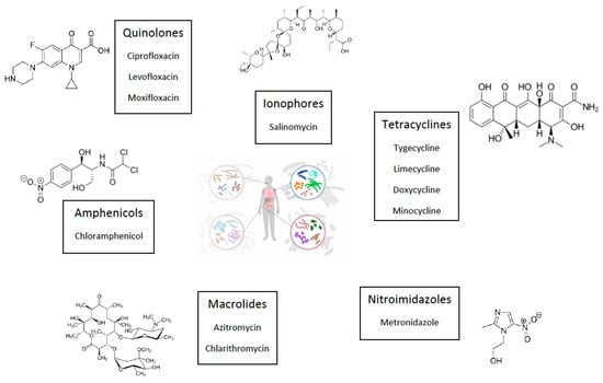 Main common antibiotic classes and specific molecules involved in this study. Their bioavailability in various body districts and complex interaction with different compositions of local microbiota make it very difficult to predict their antitumor and systemic effects. Preclinical and clinical evidence has therefore been empirically reviewed.