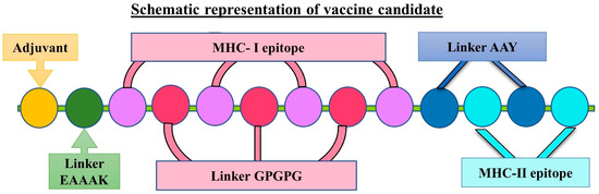 Schematic representation of the multi-epitope-based vaccine designed by linking the MHC-I and MHC-II epitopes of F. nucleatum with the different linkers and adjuvant. Reproduced with permission from https://www.mdpi.com/2076-393X/11/3/525 [108]. Accessed on 20 December 2024.