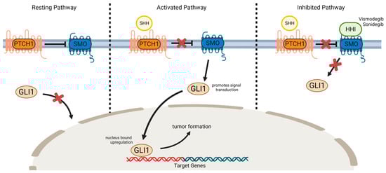 In the 1990s, genetic analyses of Gorlin Syndrome families found an allelic loss on chromosome 9q22, linked to the human homologue of Patched (PTCH1), showing germline mutations in one allele of patients. Affected individuals were observed to develop multiple basal cell carcinomas in young adulthood, indicating a role of above genetic aberration in these tumors [18]. The tumor suppressor-gene PTCH1 encodes a transmembrane receptor protein for hedgehog family signaling molecules such as sonic hedgehog (SHH). SHH signaling regulates cell growth and differentiation during embryogenesis, but is suppressed in adults through PTCH1 in the absence of SHH [19,20]. Activation of the SHH signaling pathway occurs through the binding of SHH to the PTCH1 receptor, which relieves the inhibitory effect of PTCH1, hence disinhibiting a surface membrane protein named “Smoothened” (SMO). SMO is a G-protein linked transmembrane receptor and promotes signal transduction through Glioma associated oncogene 1 (GLI1) activation. Consequently, this results in the nucleus-bound upregulation of oncogenes. Particularly mutated PTCH1 may further disinhibit SMO until SHH-independent pathway activation occurs, eventually resulting in cell cycle disruptions, uncontrolled proliferation and ultimately tumor formation (Figure 1) [19]. Genetic and molecular analyses of sporadic BCCs detected PTCH mutations in 70% and SMO mutations in 10% of tumors [21]. Furthermore, other UV-induced somatic mutations, and the inhibition of the tumor-suppressor-gene Tp53, contribute to BCC development [22,23].