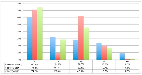 Treatment Response (assessed by investigator-review) in patients with laBCC treated with vismodegib/sonidegib in the ERIVANCE`/BOLT+ trial [26,45,46]; ′ 39-month analysis, adjusted with RECIST criteria; * 42-months analysis, adjusted with mRECIST criteria; *′ 42-month analysis adjusted with ERIVANCE-like RECIST criteria. Abbreviations: CR, complete response; ORR, objective response rate; PD, progressive disease; PR, partial response; SD, stable disease.