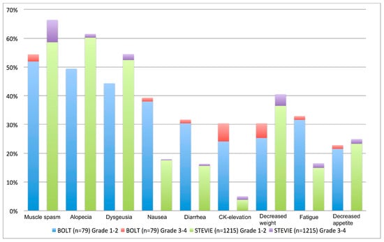 Treatment-related adverse events (AE) were observed in 98 to 100% of patients across all trials, with typical class-specific AEs such as muscle spasms (66–79%), alopecia (62–66%), and dysgeusia (55–67%) occurring most frequently [24,47,48].