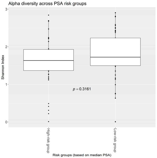 Stratification of the 89 PROVENT samples based on the median PSA of the cohort resulted in two groups, the High-risk group (mean/median PSA = 10.14/9.80 ng/mL) and the Low-risk group (mean/median PSA = 4.84/5.10 ng/mL). To evaluate the microbiome on these samples, we first calculated the alpha diversity per sample and then compared the alpha diversity (Shannon Index—H’) between the two risk groups (Figure 1). This showed a slightly smaller median alpha diversity in the High-risk PSA group, but no statistical significance was observed (ΔH’ = 0.144, p = 0.316).