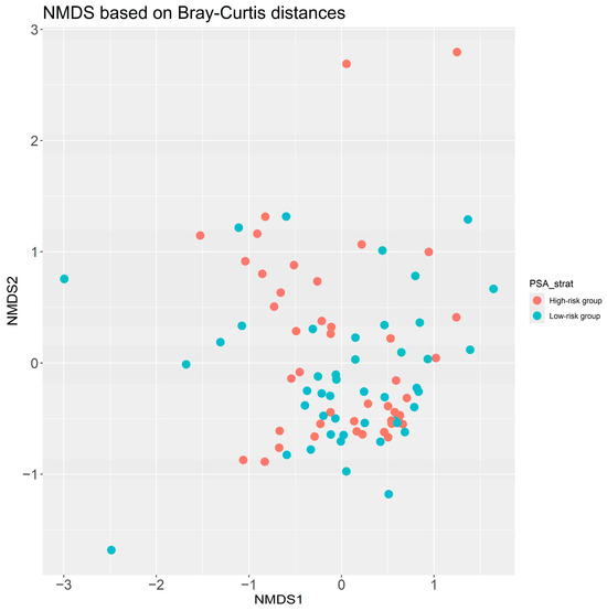 Non-metric Multidimensional Scaling (NMDS) analysis based on Bray–Curtis distances. Stratification of samples to high/low-risk PSA groups was done based on median PSA of the PROVENT samples: PSA > 7.1—High-risk PSA group, PSA ≤ 7.1—Low-risk PSA group.