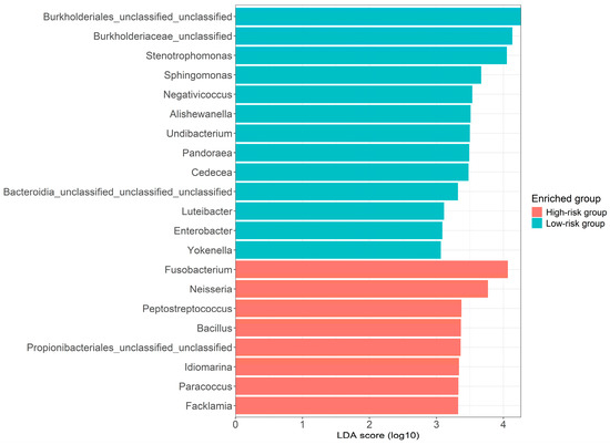 LEfSe analysis was implemented to uncover the specific bacteria that were statistically enriched in the high/low-risk groups. This statistical test uses the Kruskal–Wallis rank-sum test to detect features (i.e., microbial genera) with statistically significant differences between groups (i.e., high/low-risk groups) and calculates the effect size of each feature using linear discriminant analysis (LDA). It identified 13 enriched genera in the Low-risk group and 8 genera in the High-risk group (Figure 3), including Peptostreptococcus and Fusobacteria from the six bacteria identified in the culturomics cohort.