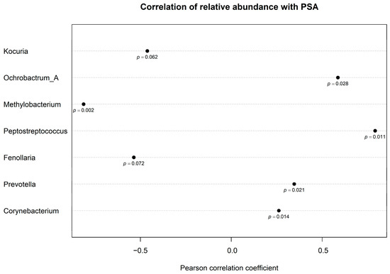 In order to further verify these observations in the context of the complete data from the PROVENT study, we performed Pearson correlation analysis between PSA and the relative abundances (>0 relative abundance prevalence) of all the genera. Moderate to strong Pearson correlation coefficients (−0.813 < r < 0.791) with p-values < 0.1 were observed between PSA and the relative abundances of seven genera (Figure 4).