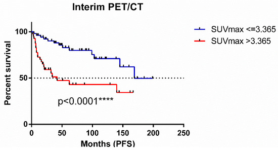 We performed an ROC (receiver operating characteristic) analysis (Figure 4), which revealed a powerful prognostic indicator for PFS based on interim PET/CT SUVmax results. With a significant difference observed at a cut-off of 3.365 (p < 0.0001), the figure demonstrates a stark contrast in outcomes. Patients exhibiting an SUVmax of 3.365 or lower experienced markedly superior PFS, reflected in a median survival of 169 months. Conversely, those with SUVmax exceeding 3.365 faced a significantly shorter median survival of 42 months. This finding underscores the potential of interim PET/CT SUVmax, particularly at this identified threshold, to effectively stratify patients and predict long-term outcomes.