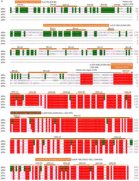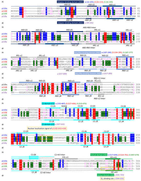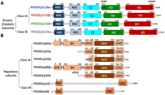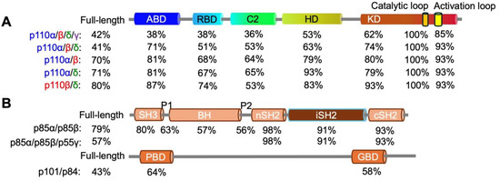 The cloning of PI3K genes and purification of recombinant proteins have sparked the interest of many research groups in revealing the 3D conformations of PI3K complexes through extensive biochemical analyses, X-ray crystallography, nuclear magnetic resonance (NMR) spectroscopy, or the cutting-edge cryo-electron microscopy (cryo-EM) technique [18,25,35,39,41,43,44,45,46,47,48,49,50,51,52,53,54,55,56,57,58,59,60,61]. These studies have identified functional domains in both kinases and adaptors, as well as crucial roles of inter-subunit or intra-subunit protein–protein interactions in regulating PI3K activity. Class I kinases are composed of different numbers of amino acids (α: 1068, β: 1070, δ: 1044, and γ: 1102), as illustrated in Figure 2 and Figure 4A. Adaptors also have diverse compositions in amino acid sequences (p85α: 723, p85β: 728, p55γ: 461, p55α: 454, p50α: 361, p101: 880, and p84: 754), as summarized in Figure 3 and Figure 4B. Both Class IA and IB kinases contain five conserved functional domains (Figure 4A), which are, from N-terminus to C-terminus, the adapter-binding domain (ABD), Ras/Rho-binding domain (RBD), C2 domain (C2), helical domain (HD), and kinase domain (KD). Unlike kinases, Class IA and IB adaptors differ significantly in their protein sequences (Figure 3) and 3D functional structures (Figure 4B). Adaptors within the IA subclass also vary in their protein sizes due primarily to N-terminal deletions. For example, p85α and p85β shared similar amino acid compositions and domains; however, p55γ and the two p85α splicing forms, p55α and p50α, lack approximately 300–400 residues spanning several domains at the N-terminus (Figure 4B). IA adaptors p85α/p85β harbor the Src-Homology 3 domain (SH3), Proline-rich domain 1 (P1 or PR1), Breakpoint-Cluster-Region Homology domain (BH) or GTPase-activating protein domain (GAP), Proline-rich domain 2 (P2 or PR2), N-terminal Src-Homology 2 domain (nSH2), inter SH2 domain (iSH2), and C-terminal SH2 domain (cSH2). In contrast, other N-terminus-lacking IA adaptors only contain three SH2 domains. The 3D structures of p101 and p84 are largely unknown, with only the N-terminal p110γ-binding domain (PBD) and C-terminal Gβγ-binding domain (GBD) being identified recently [62].