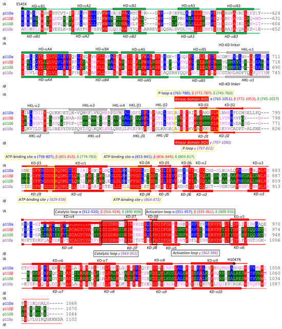 Alignment of Class I PI3K kinases. Protein sequences of PI3K kinases were obtained from UniProt: PIK3CA/p110α: P42336; PIK3CB/p110β: P42338; PIK3CD/p110δ: O00329; PIK3CG/p110γ: P48736. Sequence alignment was performed using Clustal Omega and COBALT. Structural and functional domains were annotated based on UniProt and published literature (PMID:10580505; 18633356; 21362552; 34452907). Functional domains are color-coded: ABD (dark blue), RBD (light blue), C2 (cyan), HD (green), KD (red), and Linker regions (grey). Domains and motifs in p110α (representing class IA) are shown on the top, while those in p110γ (IB) are shown on the bottom. Identical residues are highlighted in red (all p110 kinases), blue (class IA p110 kinases), or green (shared between p110β and p110δ). Conserved residues are shown in magenta. Structural elements such as β-sheets (arrows), α-helices (cylinders), and loops/turns (lines) are indicated with undetermined regions represented by dotted lines. Key motifs, including nuclear localization signal, ATP-binding sites, catalytic loop, and activation loop, are labeled. Oncogenic mutations are marked with an asterisk.