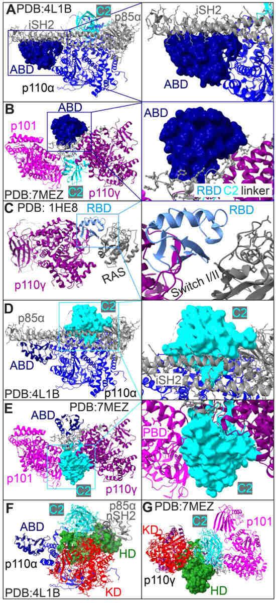 Intra- and inter-subunit interactions in PI3K protein complexes. 3D structures of PI3K protein complexes were retrieved from the PDB database and analyzed using ChimeraX-1.8. Full structures are displayed in the left panel, while the right panel highlights enlarged structures with detailed interface interactions. The interactions include: (A) Between p110α’s ABD and p85α’s iSH2; (B) Between p110γ’s ABD and RBD C2 linker; (C) Between p110γ’s RBD and RAS; (D) Between p110α’s C2 and p85α’s iSH2; (E) Between p110γ’s C2 and p101′s PBD; (F) Between p110α’s HD and p110α’s C2/KD/p85α’s nSH2; (G) Between p110γ’s HD and p110γ’s C2/KD/p101. PDB access numbers for representative structures are provided.