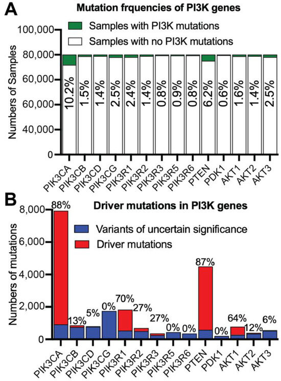 Mutations in PI3K genes in cancer. Data were retrieved from cBioportal, encompassing 800,085 tumor samples across 149 tumor types from 224 studies. (A) Mutation frequencies of PI3K genes. The figure shows the number of samples with or without mutations in PI3K genes as well as mutation frequencies. Mutation frequencies were calculated by dividing the number of samples with PI3K mutations with the total number of samples. (B) Driver mutations in PI3K genes. Shown are numbers of mutations either recognized as driver mutations or variants of uncertain significance. Frequencies of driver mutations, which were obtained by dividing the number of driver mutations by the total number of mutations, are also shown.