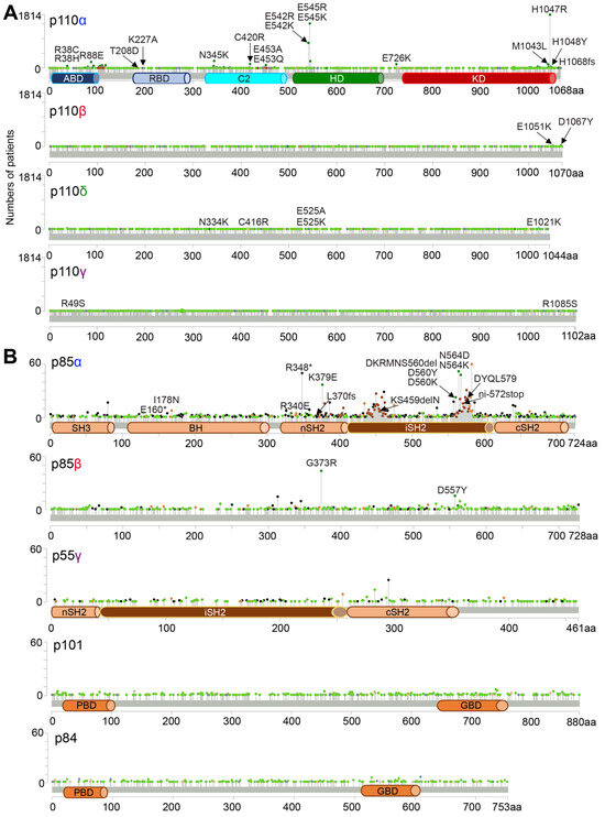 Among PI3K adaptors, p85α exhibits the most frequent genetic alterations, with a mutation frequency of 2.4% (Figure 9A) and a driver mutation frequency of 70% (Figure 9B), higher than that of other adaptors. These mutations, especially in the nSH2 and/or iSH2 domains, are notably common in endometrial cancer, where approximately 30% of cases feature mutations in PIK3R1 gene [115]. Specific mutations, including deletions or single-residue changes, can activate PI3K signaling, contributing oncogenesis. For instance, deletions or truncations of the C-terminal cSH2 domain (Figure 10B) have been shown to enhance the transformation potential of nSH2 mutants such as p85αK379E and p85αR340E [116]. Mutations in exon 11 of the PIK3R1 gene can result in a shortened iSH2 domain (e.g., deletions of residue 434–475), leading to the release of PI3Kδ inhibition [117]. This causes type 2-activated PI3K syndrome, associated with an increased risk of lymphoma, similar to the mutations in PI3Kδ that cause activated PI3Kδ syndrome 1. Additionally, hemizygous deletion of the PIK3R1 gene, commonly observed in breast cancer, has been shown to transform human mammary epithelial cells [118]. The aforementioned mutations suggest that PIK3R1 acts as a tumor suppressor by inhibiting oncogenic p110 kinases. Defective p85α and its splicing isoforms often result in constitutive activation of PI3K signaling, driving oncogenesis. However, mutations in the N-terminal domains of p85α, such as SH3 and BH, have been reported to exhibit p110-independent activities, activating other survival signaling pathways that may promote oncogenic transformation [119,120].