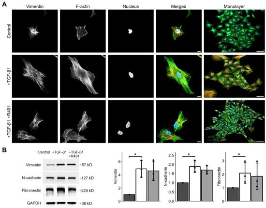 TGF-β1-induced cell and cytoskeletal EMT phenotypes in A549 lung cancer cells, with and without ALD-R491 treatment. A549 cells treated without or with TGF-β1, and subsequent ALD-R491 treatment (R491), with regards to (A) vimentin, F-actin, or nuclei, as indicated, with merged images showing vimentin (red), F-actin (green), and nuclei (blue). Scale bars 10 (left) and 50 µm (right). (B) Protein levels of EMT markers (left), as quantified (right) for control (dark grey), treatment with TGF-β1 (white), followed by ALD-R491 (light grey). Bar plots show mean, error bars standard deviation (SD), black dots the values of each biological repeat, p ≤ 0.05 (*). Representative cells are shown.