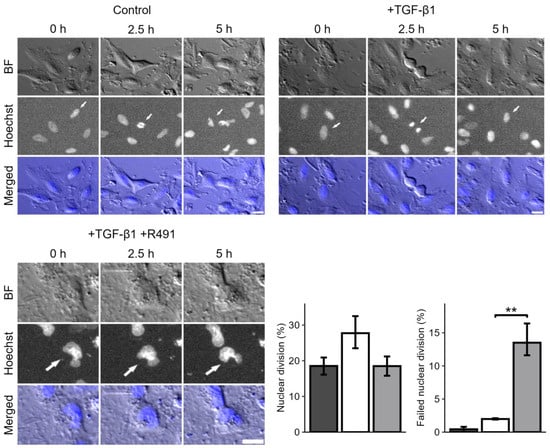 Nuclear division was monitored for 10 h by counting the cell nuclei using FIJI (version 1.54j). All well-demarcated and not-overlapping cell nuclei were manually outlined with the “Freehand selections” tool. Nuclei that underwent division and failed to divide, showing an “hourglass” nuclear shape, were counted. Numbers of total nuclei of cells used for cell division, control (N = 232), TGF-β1 (N= 101), and TGF-β1 + ALD R491 (N = 200). Two positions were used per condition. All images shown were auto-levelled in FIJI (version 1.54j).