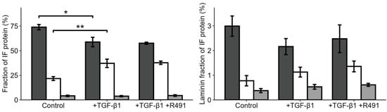 TGF-β1 increases vimentin and reduces keratin in the intermediate filament fraction of the cytoskeleton. The proportion of (left) keratin (dark grey), vimentin (white), and lamins (light grey) in the intermediate filament fraction, or of the (right) lamin A (dark grey), lamin B1 (white), and B2 (light grey) of all lamins in A549 lung cancer cell treated without (control) or with TGF-β1 and subsequent ALD-R491, as indicated. Bar plots show mean, error bars standard deviation (SD), p ≤ 0.05 (*), p ≤ 0.01 (**).