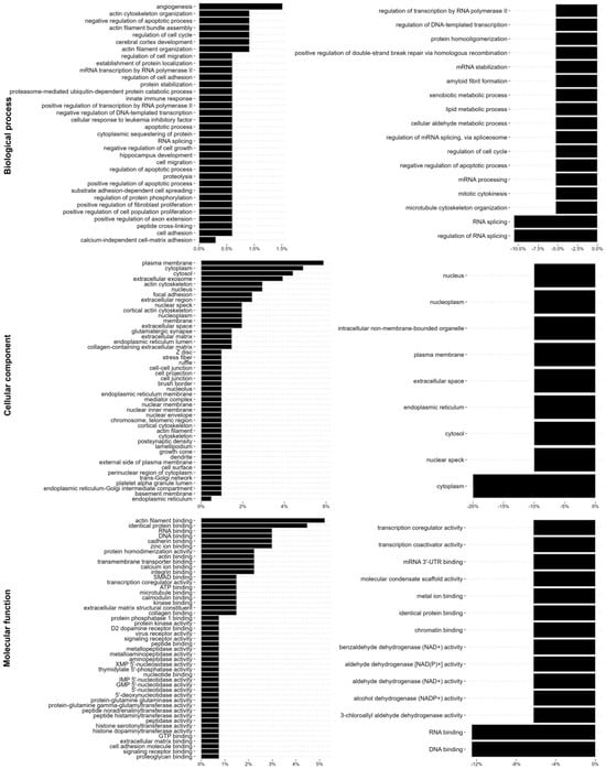 The EMT increases binding to the intermediate filaments of proteins that regulate the cell–extracellular matrix adhesion, cytoskeleton, cell shape, and cell motility, while ALD-R491 reduces binding of RNA metabolism and function. The changes of the vimentin interactome upon EMT (left) and by additional ALD-R491 treatment (right), shown as percentages, with biological function (top), cellular compartment (middle), and molecular function (lower), as indicated.