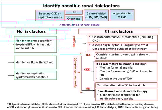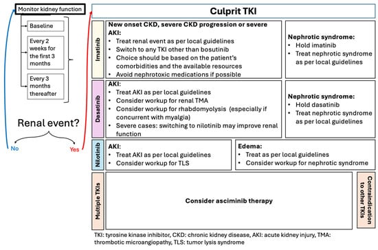 Background: Renal adverse drug reactions (ADRs) associated with tyrosine kinase inhibitors (TKIs) in the treatment of chronic myeloid leukemia (CML) are relatively rare, and there is currently no standardized protocol for their management. Therefore, this study aimed to summarize renal ADRs related to TKIs use in CML and propose an evidence-based approach to monitor and manage these ADRs. Methods: A systematic literature review was performed to identify renal ADRs associated with TKIs in CML. Two authors screened the search results and extracted data from 37 eligible studies. These findings were then used to develop a scheme for clinicians to monitor and manage these ADRs. Results: Overall, imatinib seemed to be significantly linked to renal adverse events compared to other TKIs, and switching to dasatinib or nilotinib significantly improved renal function. Similar events were reported with bosutinib, although they were not statistically significant. However, most of the renal events reported on dasatinib were described as nephrotic syndrome that resolved with switching to imatinib. Few cases were reported with nilotinib that described tumor lysis syndrome (TLS)-related kidney injury. Conclusions: Recommendations include monitoring for progressive decline in the estimated glomerular filtration rate with imatinib, nephrotic syndrome with dasatinib, and TLS with nilotinib. Additionally, holding the offending TKI and managing renal ADRs according to local guidelines were adopted more frequently than reducing the TKI dose.