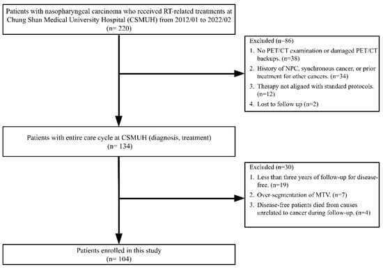 In the second stage, an additional 30 patients were excluded for the following reasons: nineteen disease-free patients had follow-up periods of <3 years. Seven patients experienced over-segmentation during the delineation of MTVs. Four disease-free patients died from causes unrelated to cancer during the follow-up period. Ultimately, 104 patients who met all inclusion criteria were included in this study.