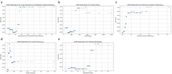 SHAP dependence plot for the top 5 radiomic features contributing to the AdaBoost model. (a) High dependence low metabolic uptake level emphasis50, (b) surface area50, (c) maximal correlation coefficientDiff, (d) inverse varianceDiff, and (e) interquartile range60.