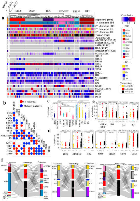 Mutational signature analysis of whole-genome sequencing (WGS) breast tumors. We analyzed SBSs, IDs, and DBSs in 569 whole genomes of breast tumors. (a) Non-negative matrix factorization (NMF)-based de novo mutational signatures of tumors visualized by a heatmap divided based on distinct signature status. The signature group, the first and second dominant SBS and ID signatures and the tumor grades are annotated at the top. The contribution values of each signature are shown by a color scale. Color codes representing each dominant mutational signature are shown. For mutational signatures with known etiology, both signature and etiology are indicated. (b) Interaction of signatures with each other measured by hypergeometric test: red represents co-occurrence and blue represents mutual exclusivity. (c) Contribution values of SBS and ID mutational signatures. (d) Comparing contribution values of SBS signatures in different tumor stages. (e) Comparing contribution values of ID signatures in different tumor stages. (f) Dominant signature in genomes of different grades of tumors: left—the first and second dominant SBS mutational signatures; middle—the first and second dominant ID mutational signatures; right—signature groups of different grades of tumors. Dominant signatures were based on the contribution value of detected mutational signatures. As denoted in the color gradient guide above, the exposure of each signature, i.e., contribution, has values between 0 and 1. We allocated gray to a value of zero and red to a value of 1, then made a gradient of colors with different shades of blue and red corresponding to each contribution value. Mutational signature groups are assigned based on the first and second dominant signature of each sample. The Others signature group is assigned when the first and/or second dominant signature of a sample is SBS1 (aging) and/or SBS5.