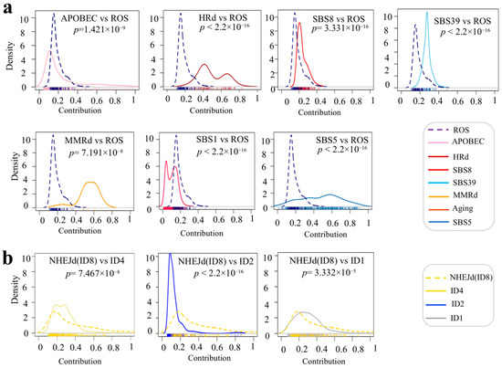 Kernel density comparing distribution of mutational signatures’ relative contribution in breast tumors. (a) Distribution of relative contribution for ROS compared with other SBS mutational signatures in density plots. (b) Distribution of relative contribution for NHEJd (ID8) compared with other ID mutational signatures in density plots. The X axis represents contribution. Ticks for each contribution value are presented under the distribution curves. The Y axis is a kernel density estimate to show the probability density. Only samples with counts more than zero are shown. p values were calculated using K.S. test.