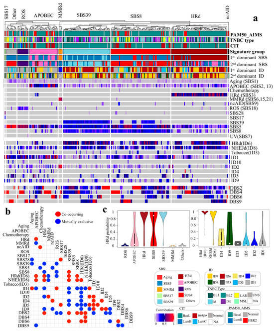 Mutational signature analysis of TNBC whole-genome sequencing (WGS) tumors. We analyzed SBSs, IDs and DBSs in 237 whole genomes of TNBC tumors. (a) NMF-based de novo mutational signatures of TNBC tumors visualized by a heatmap divided based on distinct signature status. The signature group, the first and second dominant SBS and ID signatures and tumor staging are annotated at the top. Different tumor staging systems, including PAM50_AIMS, TNBC type and CIT, are shown. The contribution values of each signature are shown by a color scale. Color codes representing each dominant mutational signature are shown. For mutational signatures with known etiology, both signature and etiology are indicated. (b) Interaction of signatures with each other measured by hypergeometric test: red represents co-occurrence and blue represents mutual exclusivity. (c) Comparing HRd scores of different SBS and ID signatures. Mutational signature groups are assigned based on the first and second dominant signature of each sample. The Others signature group is assigned when the first and/or second dominant signature of a sample is SBS1 (aging) and/or SBS5.