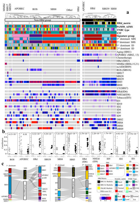 Comparing mutational signatures of TNBC tumors with HRd and non-HRd status. TNBC cases were assigned to two distinct group of HRd and non-HRd. The HRd group contains tumors with bi-allelic mutations of BRCA1/2 or PALB2, while the non-HRd TNBC group contains tumors with an HRd score less than 0.1. (a) NMF-based de novo mutational signatures of HRd TNBC tumors (right) and non-HRd TNBC tumors (left) visualized by a heatmap divided based on distinct signature status. The signature group, the first and second dominant SBS and ID signatures and tumor staging are annotated at the top. Different tumor staging systems, including PAM50_AIMS, TNBC type and CIT, are shown. The contribution values of each signature are shown by a color scale. Color codes representing each dominant mutational signature are shown. For mutational signatures with known etiology, both signature and etiology are indicated. (b) Comparing contribution values of SBS and ID signatures in HRd and non-HRd TNBC tumors [HRd (+): black dots vs. HRd (−): gray dots]. p values were calculated using the Mann–Whitney U test. (c) Dominant signature analysis of TNBC tumors with HRd and non-HRd status: left—the first and second dominant SBS mutational signatures; right—the first and second dominant ID mutational signatures. Mutational signature groups are assigned based on the first and second dominant signature of each sample. The Others signature group is assigned when the first and/or second dominant signature of a sample is SBS1 (aging) and/or SBS5.