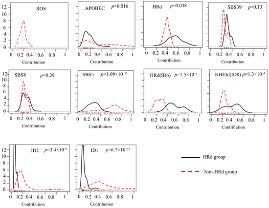 Significant difference in distribution of mutational signatures’ contribution in HRd and non-HRD TNBC tumors. TNBC cases were assigned to two distinct groups of HRd and non-HRd. The HRd group contain tumors with bi-allelic mutations of BRCA1/2 or PALB2, while the non-HRd TNBC group contains tumors with an HRd score less than 0.1. Distribution of mutational signatures’ contribution is compared using kernel density plots. The X axis represents contribution. Ticks for each contribution value are presented under the distribution curves. The Y axis is a kernel density estimate to show the probability density. Only samples with counts more than zero are shown. p values were calculated by the K.S. test.