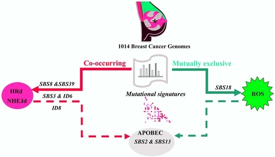 3.1. Mutational Signatures of Breast Tumors Genomes Reveal Mutual Exclusivity of HRd and NHEJd with ROS and MMRd as Well as Their Co-Occurrence with APOBEC