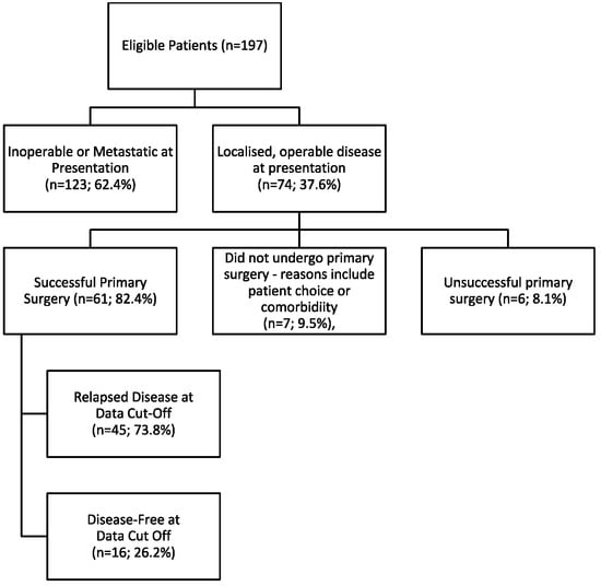 Between January 2019 and August 2022, 197 BTC patients were identified—71 patients were local to UCLH, while 126 were referrals for clinical trials or second opinions. The most common histological subtype was cholangiocarcinoma (n = 142; 72.1%). Table 1 lists population demographics and characteristics. At diagnosis, only 74 patients (37.6%) presented with resectable disease (Figure 1; Table 1), with 61 (82.4%) proceeding to surgery and 32 (52.5%) receiving adjuvant SACT (26 received capecitabine; 42.6%). Reasons for not receiving adjuvant therapy included patient choice, poor post-operative performance status, early post-operative disease progression or inoperable disease discovered intraoperatively. Overall, 168 patients were defined as incurable BTC for subsequent survival analyses, based on inoperable, metastatic or relapsed disease.