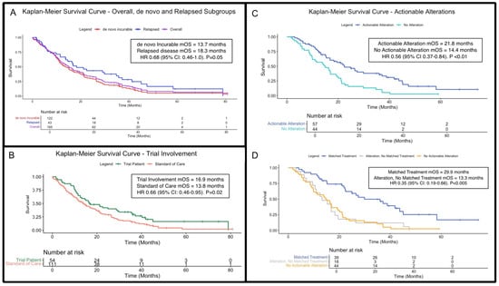 Kaplan–Meier overall survival (OS) curves for patients with incurable disease. (A) OS curves for the incurable cohort (purple), alongside de novo incurable (red) and relapsed disease (blue) subgroups (p = 0.054). (B) OS for clinical trial enrolment (green) vs. standard-of-care treatments (orange; p = 0.02). (C) OS stratified by presence (blue) and absence (turquoise) of actionable genetic alterations (regardless of whether patients received matched, targeted treatments; p < 0.01). (D) OS further stratified by receipt of treatment matched to actionable alterations, if applicable (p < 0.005). Abbreviations: BTC = biliary tract cancers; HR = hazard ratio; OS = overall survival; mOS = median overall survival.
