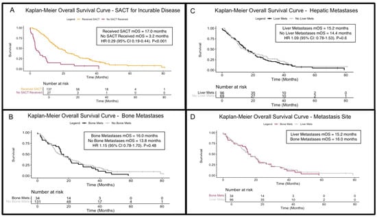 Kaplan–Meier overall survival (OS) curves for patients with incurable disease. (A) OS curves for patients receiving (amber) or not receiving (maroon) systemic anti-cancer therapies in the incurable (metastatic/inoperable/relapsed) setting (p < 0.001). (B) OS stratified by the presence (black) and absence (grey) of bone metastases (p = 0.48). (C) OS stratified by the presence (black) and absence (grey) of liver metastases (p = 0.6). (D) Comparison of OS in patients with liver metastases (grey) to those with bony metastases (purple), showing comparable outcomes. Abbreviations: HR = hazard ratio; mets = metastases; SACT = systemic anti-cancer therapy/therapies; mOS = median overall survival.