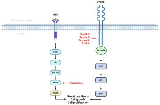 Targeted therapy in the management of RCC. VEGFR: Vascular endothelial-derived growth factor receptor pathway leads to downstream activation of RAS-GTP, increasing cell growth and proliferation. Sunitinib, Axitinib, Sorafenib, and Pazopanib are the agents that block the intracellular domain of the VEGFR. Mammalian Target of Rapamycin (MTOR) inhibitors will block the PI3K/AKT pathway, inhibiting protein synthesis and cell proliferation.