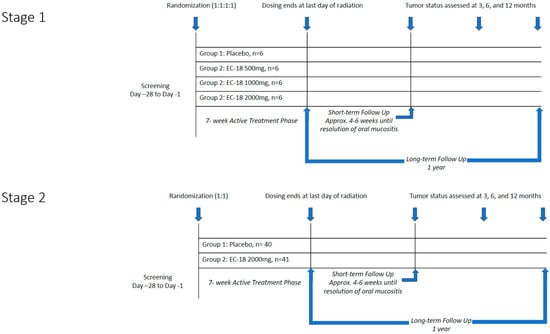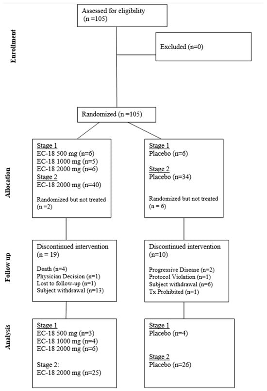 Stage 2 evaluated both the safety and efficacy of the highest acceptable dose of EC-18 based on the Stage 1 results (2000 mg per day). Eighty-one subjects were randomized in a 1:1 scheme to receive either placebo or EC-18 (Figure 2). The study drug (EC-18 1000 mg or placebo) was administered twice daily (2000 mg per day) within 30 min of the patient’s first or last meal, beginning on the first day of radiation and continuing until the last day of radiation.