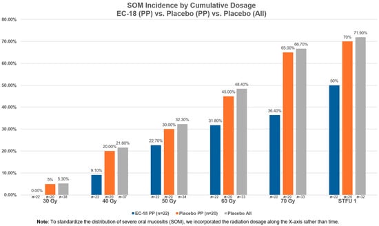 Similarly, among patients in the per protocol population, EC-18 favorably impacted SOM incidence during the active treatment period. Whereas SOM was noted in 65.0% (13/20) of placebo patients, it was noted less (40.9%; p = 0.30) in patients treated with EC-18 (Table 1). EC-18 also blunted the SOM trajectory. The proportional incidence of SOM at cumulative radiation doses of 10 Gy (2 Gy fractions were delivered 5 days per week) was favorably attenuated in EC-18-compliant patients vs. placebo controls.