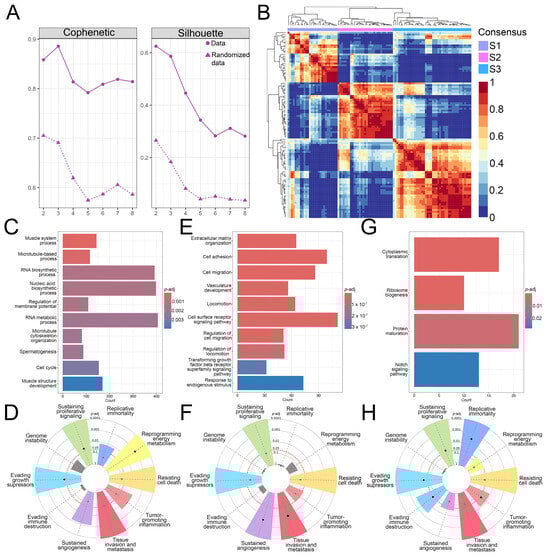 To classify the 102 obtained non-metastasized, non-treated OS patient samples into subtypes and determine their molecular signatures, the NMF R package was utilized. The optimal rank for the NMF algorithm was determined, based on the calculated cophenetic and silhouette values (Figure 1A) and the analyzed OS samples were classified into three subtypes, S1 (27 samples), S2 (31 samples), and S3 (44 samples) with no difference in survival between them (Figure 1B, Figure S3). Functional enrichment analyses of the DEGs identified for each of the OS subtypes showed that S1 exhibits enriched cell cycle, microtubule-associated processes, and RNA metabolism processes (Figure 1C). On the other hand, subtype S2 had enriched processes related to the extracellular matrix organization, migration, vasculature development and transforming growth factor-beta signaling (Figure 1E). The subtype S3 showed enrichment in cytoplasmic translation, ribosome biogenesis, protein maturation and the Notch signaling pathway (Figure 1G). Further, we utilized CancerHallmarks [61], which provides a consensus gene set associated with ten cancer hallmarks, facilitating a comprehensive enrichment analysis. Using this platform, we identified cancer hallmarks overrepresented in each of the subtypes. All three identified subtypes showed statistically significant enrichment in four hallmarks–sustaining proliferative signaling, resisting cell death, tissue invasion and metastasis, and evading growth suppressors (Figure 1D,F,H). In addition to the identified similarities, our analysis has revealed significant differences between the three subtypes. Namely, S1 has shown a marked enrichment of reprogramming energy metabolism (Figure 1D), while S2 had significant enrichment in the sustained angiogenesis hallmark (Figure 1F). S3 had a statistically significant enrichment in replicative immortality and evading immune destruction (Figure 1H).