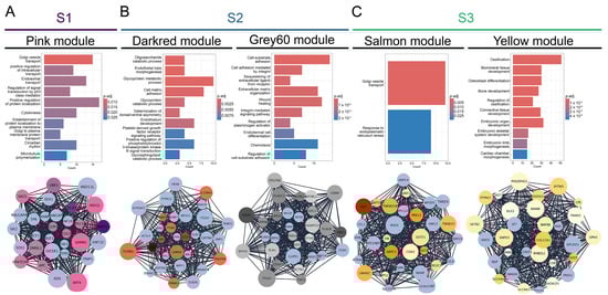 Coexpressed module hub genes and module biological process enrichment. (A) S1-correlated pink module (B) S2-correlated darkred and grey60 modules (C) S3-correlated salmon and yellow modules.