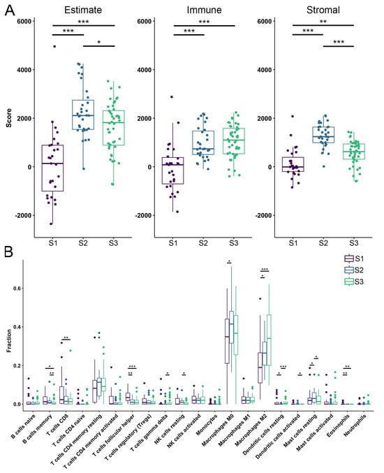 Tumor microenvironment and tumor-infiltrating immune cells. (A) Estimate, the immune and stromal scores of each subtype predicted by ESTIMATE algorithm. (B) Fractions of TIICs in each identified OS subtype. Purple color—S1; blue color—S2; green color—S3. Statistically significant difference is shown as: * p-value < 0.05, ** p-value < 0.01, *** p-value < 0.001. TIICs–Tumor-infiltrating immune cells; OS–Osteosarcoma.