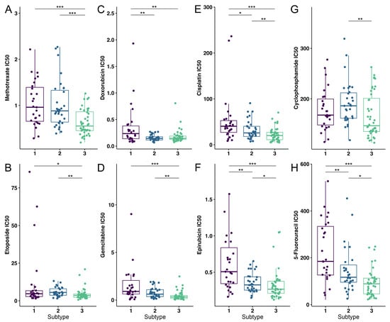 Drug susceptibility analysis of OS subtypes to eight commonly used chemotherapeutics. (A) Methotrexate, (B) Etoposide, (C) Doxorubicin, (D) Gemcitabine, (E) Cisplatin, (F) Epirubicin, (G) Cyclophosphamide and (H) 5-fluorouracil were the drugs used to test for drug sensitivity. Purple color—S1; blue color—S2; green color—S3. Statistically significant difference is shown as: * p-value < 0.05, ** p-value < 0.01, *** p-value < 0.001. OS–Osteosarcoma.