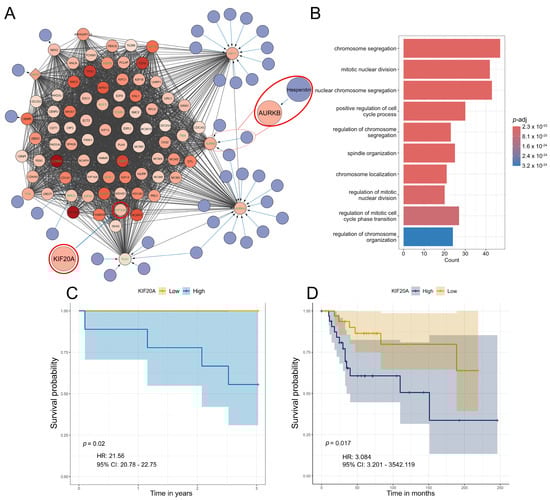 Significant S1 cluster identification and functional enrichment. (A,B) Most significant MCODE cluster and the corresponding biological process functional enrichment in S1. (C) Survival probability association plot with KIF20A in S1. (D) Survival probability association plot with KIF20A in an independent cohort. Within the identified clusters, genes have been color-coded based on Log2 fold change with increased color density representing higher fold change values. Nodes of the identified drugs are blue and connect to predicted genes via edges. The top 10% based on degree have green gene labels. Hesperidin and its target AURKB are encircled in red. KIF20A is encircled in red.