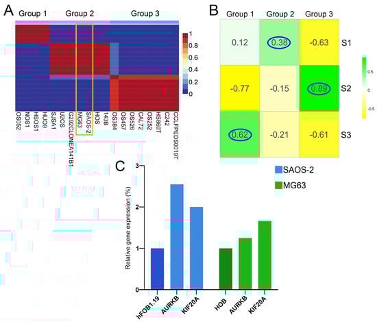 Clustering validation and OS cell line groups correlation to identified patient subtypes. (A) NMF cell line heatmap for k = 3, (B) Correlation heatmap between cell line groups and patient subtypes. (C) Relative expression level of AURKB and KIF20A genes in SAOS-2 (blue) and MG63 (green) cells compared to hFOB1.19 and HOB. SAOS-2 and MG63 are framed in orange. The highest correlations have been encircled in blue.