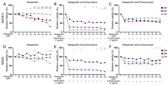 Effect of hesperidin and the combined treatment with chemotherapeutics on OS cell viability after 24 h, 48 h and 72 h of exposure. (A,B,C) Effect of hesperidin alone or in combination with doxorubicin and 5-fluorouracil on SAOS-2 cell viability. (D,E,F) Effect of hesperidin alone or in combination with doxorubicin and 5-fluorouracil on MG63 cell viability. Statistically significant differences are shown as: * p-value < 0.05, ** p-value < 0.01, *** p-value < 0.001. Black circles represent 24 h of exposure, red squares represent 48 h of exposure and green triangles represent values after 72 h of exposure. OS–Osteosarcoma.